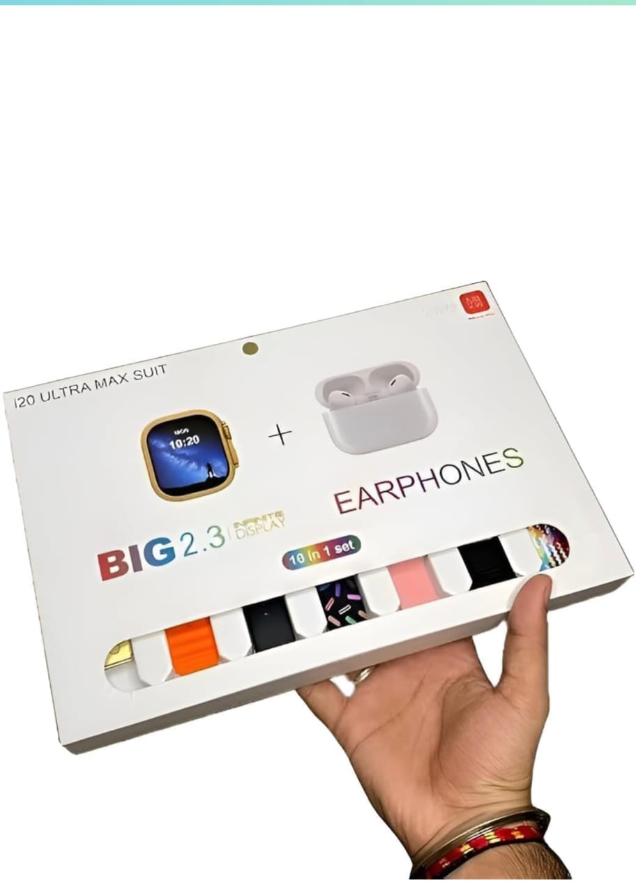 Upgrade your tech game with the i20 Ultra Max Smartwatch Combo, a 10-in-1 premium gift set designed for style, performance, and convenience. This all-in-one package includes a 2.3-inch HD Smartwatch, wireless earbuds, 7 interchangeable straps, and a magnetic charger, making it the ultimate choice for tech lovers.